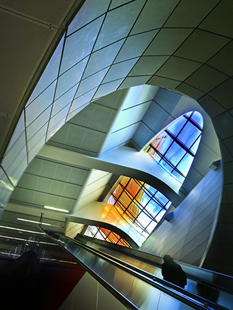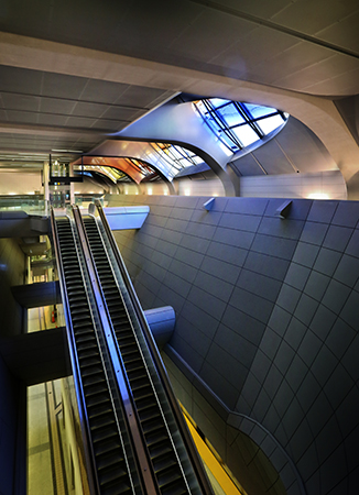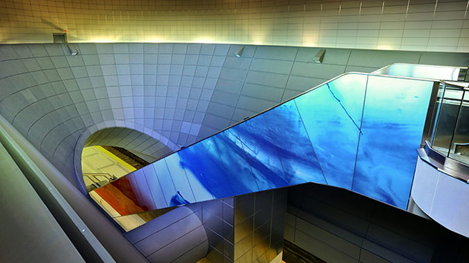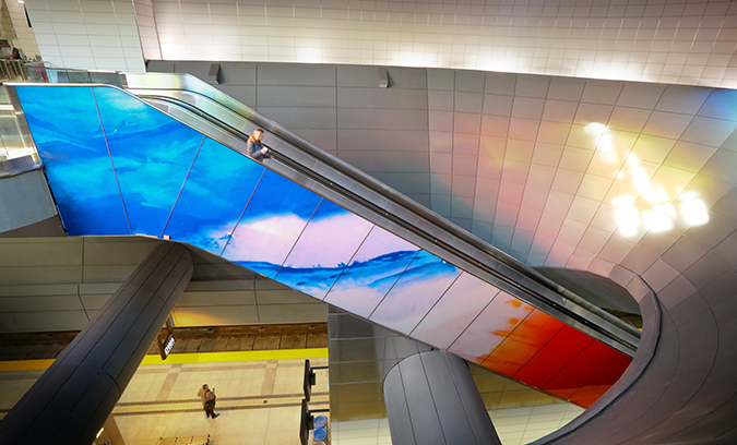 45 metre wide skylight projects natural light and colour onto escalators and subway platforms